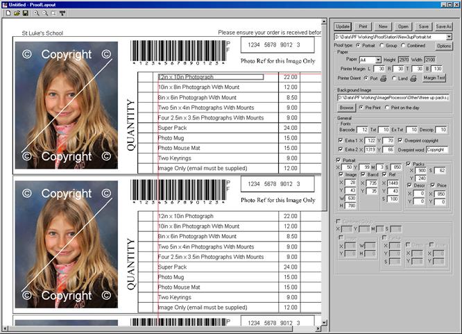 With ProofStation you are not constrained to any one particular layout for your order forms. You can design any layout you wish (as a background JPEG image) and then use the free ProofLayout software to lay each of ProofStation's order form components in the appropriate place on your order form. This information is then saved as a simple text file which is loaded into ProofStation each time you run it.