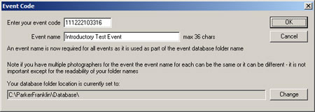 Enter your 12 digit event job code (any spaces will be ignored). See Booking an Event for getting these codes or the Practice page for some practice codes. The event name is used as part of the generated database folder name. Check that your current database location is correct; this is the location where your new event folder will be created and it may have been changed if you had continued an event in a different location at some time. Click the change button to change it if necessary.