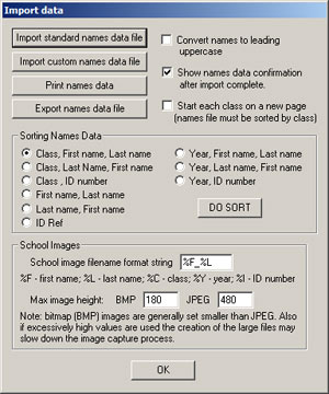 A names CSV file must be provided by the school in either a standard or custom format (see Appendix SIMS and Names Data Formats for details on these formats. Click either of the two import buttons as appropriate – it is important the option to show named data confirmation is checked and this should be checked carefully (all the way to the end) to ensure that there were no mistakes in the format of the file. Sometimes the names data you receive will have all the names in uppercase and if using this data to print captions it is probably more appropriate to have them in leading uppercase only; check the Convert names to leading uppercase to convert names like MIKE FRANKLIN to Mike Franklin - this must be checked BEFORE doing the import.