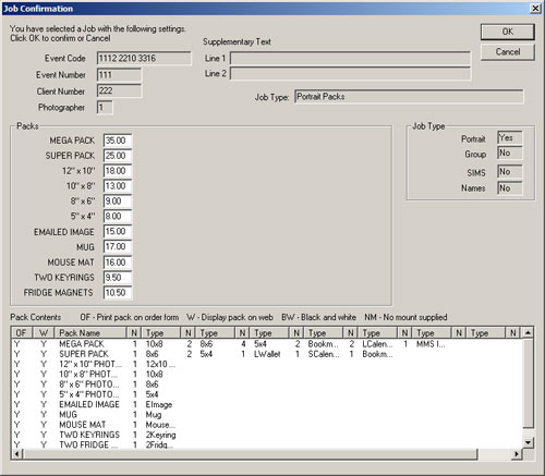You will now be presented with a Job Confirmation dialog. This displays most of the information that you have entered so far including the pack data loaded from the Pack Template file. Please do take the time to check this carefully to ensure that, in particular, the job type and the pack prices, descriptions and contents are correct; it is quite hard to change these later.