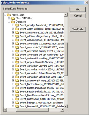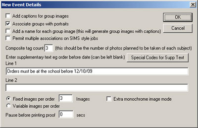 If this is a new event and not a SIMS event (school images are always generated for SIMS events) you will have the choice of creating a set of images for your school. If you click Yes an additional folder will be created in the event database called "EventImages" and below this two more folders for the actual images; one for the BMP images and one for the JPEG images. These images are normally small and their maximum height in pixels is specified in this dialog. After the event is complete the folders can be burnt to a CD and given to the school. If for nothing else, these images can be useful for you and the school in the event of parents/children losing their proof order forms, as the naming of the images allows you to easily find them again in your database.