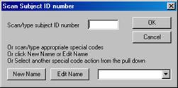 Instead of scanning the special barcodes (for example if you have not got them with you!) you can click the New Name button to add a new name, the Edit Name button to correct an incorrect name or any of the other actions from the pull down list (these include the start row actions). A no association can be achieved by simply clicking OK (or hitting return) with nothing scanned in.