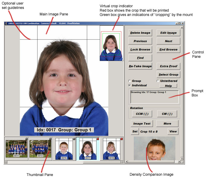 When the program is running the screen is split up into three main areas; the Main Image pane, where each image is displayed as it is taken., the thumbnail image pane below the main image pane and the Control pane where there are a number of buttons to control the various functions of the program, a prompt box for feedback information for the user and a density comparison image.